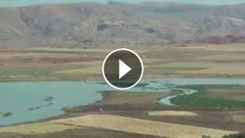 We are driving west of Fes to Volubilis in Morocco. The land is beautifully patch-worked fields and beside a lake a farmer rounds up his sheep. Backgr...