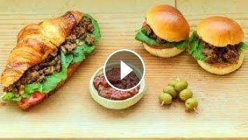 6- Remove from the oven, spread some Harissa (or ketchup), layer the slices of tomatoes and lettuce. Add the ground meat and close your sandwich.